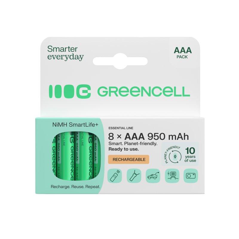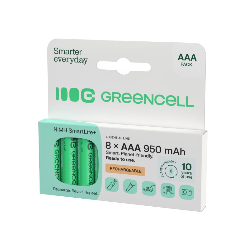 Vuosittain maailmassa käytetään yli 40 miljardia kertakäyttöparistoa, ja käytetyt paristot päätyvät usein suoraan ympäristöön. Green Cell -akut takaavat jopa 3 vuoden intensiivisen käytön, mikä vastaa monen perinteisen AAA-pariston käyttöä ! Green Cell -paristojen avulla voit vähentää jätettäsi merkittävästi ja auttaa suojelemaan ympäristöä!
