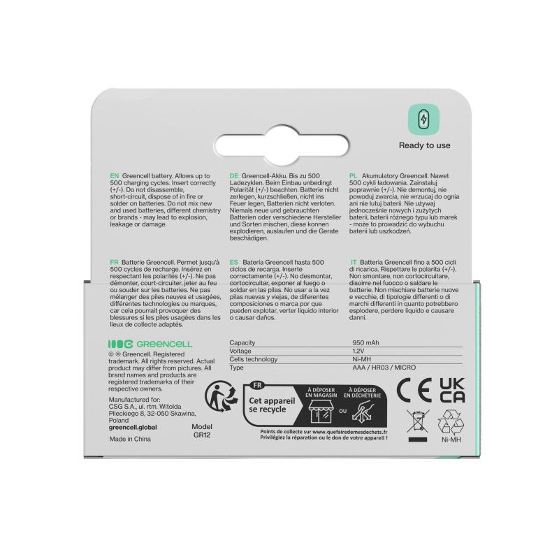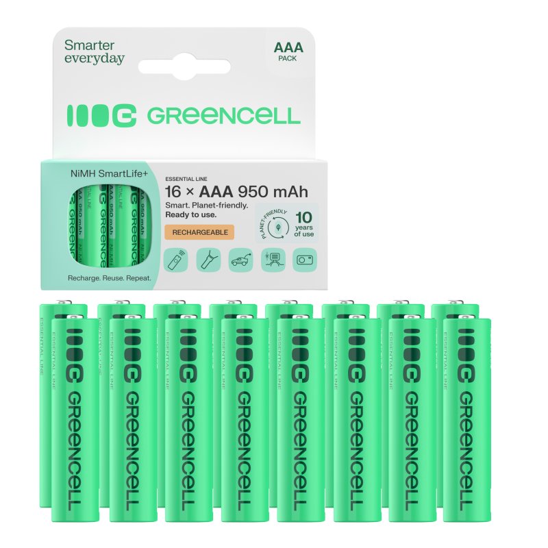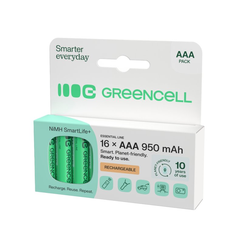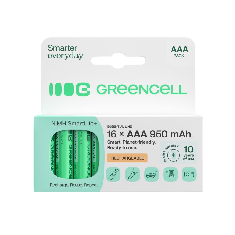 Vuosittain maailmassa käytetään yli 40 miljardia kertakäyttöparistoa, ja käytetyt paristot päätyvät usein suoraan ympäristöön. Green Cell -akut takaavat jopa 3 vuoden intensiivisen käytön, mikä vastaa monen perinteisen AAA-pariston käyttöä ! Green Cell -paristojen avulla voit vähentää jätettäsi merkittävästi ja auttaa suojelemaan ympäristöä!